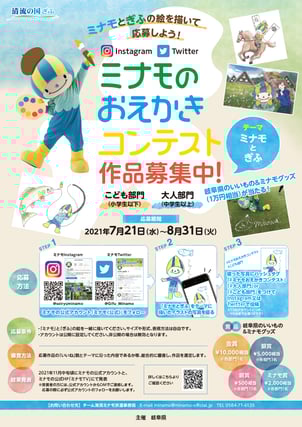 News · 2021/07/27 「ミナモのおえかきコンテスト」作品募集中! 「ミナモとぎふ」をテーマに自由に絵を描いて、InstagramとTwitterで投稿しよう! 金賞「岐阜県のいいもの&ミナモグッズ」(1万円相当)ほか、景品盛りだくさん!たくさんのご応募お待ちしております! ミナモのおえかきコンテスト詳細 tagPlaceholderカテゴリ: