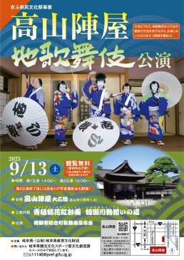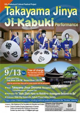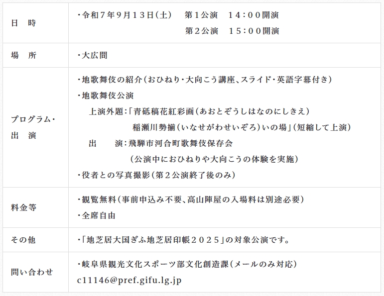 News · 2025/09/02 「高山陣屋地歌舞伎公演」開催! 岐阜県内の伝統芸能を広く国内外に発信するため、地歌舞伎公演を開催します。 地歌舞伎の魅力を体感いただくため、おひねり・大向こうの講座や役者との写真撮影もあわせて実施しますので、ご参加ください。 tagPlaceholderカテゴリ: コメントをお書きください コメント: 0