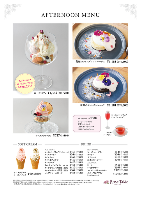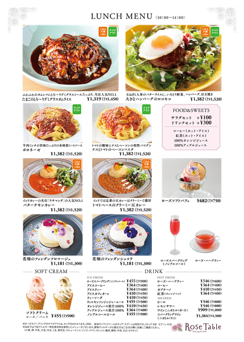 お店の自慢は、店内から眺めるウェルカムガーデンの絶景とお店の中いっぱいの花飾り。“ローズ・テーブル“の名のごとく、は世界最大規模(18品種・約5,500株)のローズペイサージュガーデンを眺めながら、様々な花木に囲まれた空間でお食事やティータイムをお楽しみいただきます。